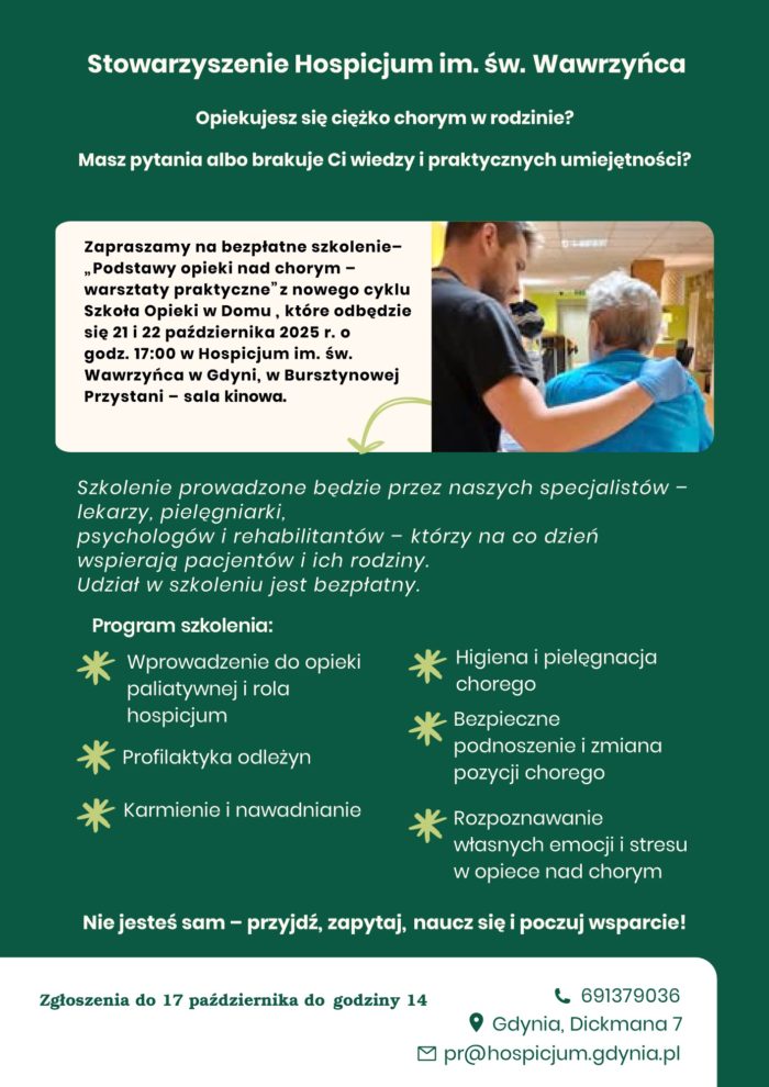Hospicjum im. św. Wawrzyńca w Gdyni zaprasza na szkolenie „Podstawy opieki nad chorym – warsztaty praktyczne” z nowego cyklu Szkoła Opieki w Domu. Spotkania odbędą się 21 i 22 października 2025 r. o godz. 17:00 w Hospicjum św. Wawrzyńca, w Bursztynowej Przystani (sala filmowa). Szkolenie poprowadzą nasi specjaliści – lekarze, pielęgniarki, psychologowie i rehabilitanci – […]